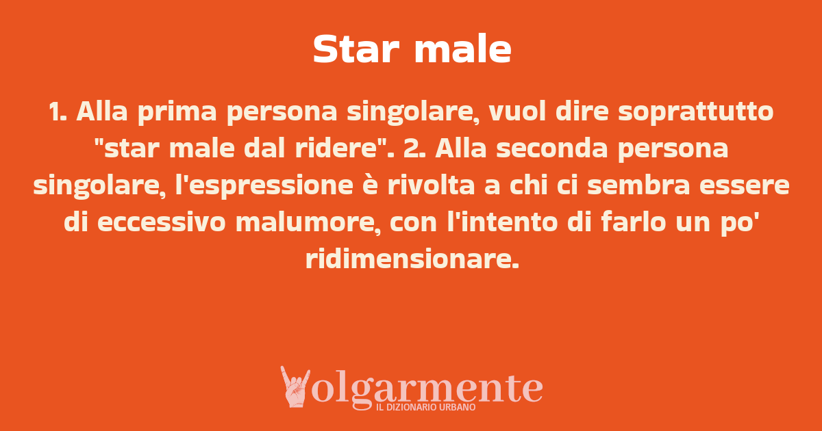 su0 down0 +0 1. Alla prima persona singolare, vuol dire soprattutto "star male dal ridere". 2. Alla seconda persona singolare, l'espressione è rivolta a chi ci sembra essere di eccessivo malumore, con l'intento di farlo un po' ridimensionare. da Anonimo Milano, MI, Lombardia