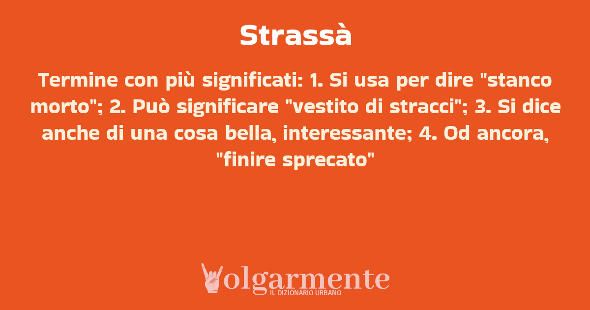 su0 down0 +0 Termine con più significati: 1. Si usa per dire "stanco morto"; 2. Può significare "vestito di stracci"; 3. Si dice anche di una cosa bella, interessante; 4. Od ancora, "finire sprecato" da Anonimo Venezia, VE, Veneto