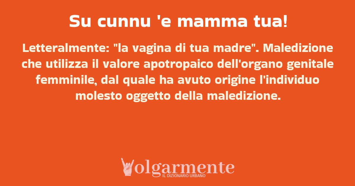 su0 down0 +0 Letteralmente: "la vagina di tua madre". Maledizione che utilizza il valore apotropaico dell'organo genitale femminile, dal quale ha avuto origine l'individuo molesto oggetto della maledizione. da Akenar Cagliari, CA, Sardegna