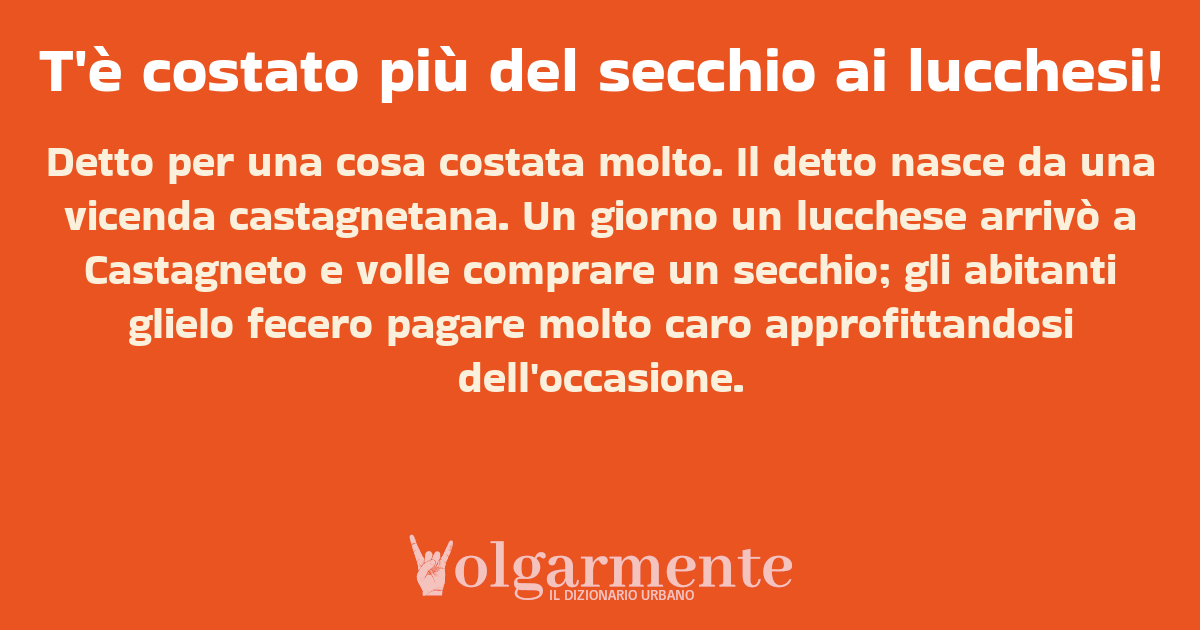 su0 down0 +0 Detto per una cosa costata molto. Il detto nasce da una vicenda castagnetana. Un giorno un lucchese arrivò a Castagneto e volle comprare un secchio; gli abitanti glielo fecero pagare molto caro approfittandosi dell'occasione. da Anonimo Castagneto Carducci, LI, Toscana