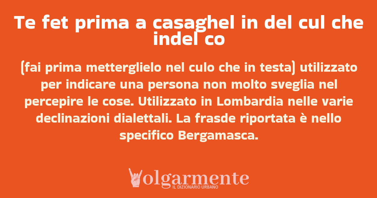 (fai prima metterglielo nel culo che in testa) utilizzato per indicare una persona non molto sveglia nel percepire le cose. Utilizzato in Lombardia nelle varie declinazioni dialettali. La frasde riportata è nello specifico Bergamasca.