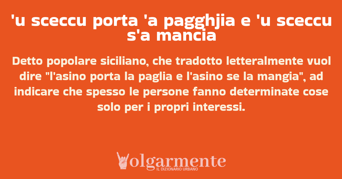 su0 down0 +0 Detto popolare siciliano, che tradotto letteralmente vuol dire "l'asino porta la paglia e l'asino se la mangia", ad indicare che spesso le persone fanno determinate cose solo per i propri interessi. da Anonimo Agrigento, AG, Sicilia