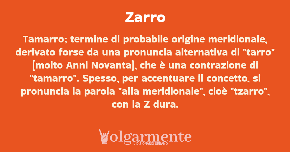 Tamarro; termine di probabile origine meridionale, derivato forse da una pronuncia alternativa di "tarro" (molto Anni Novanta), che è una contrazione di "tamarro". Spesso, per accentuare il concetto, si pronuncia la parola "alla meridionale", cioè "tzarro", con la Z dura.